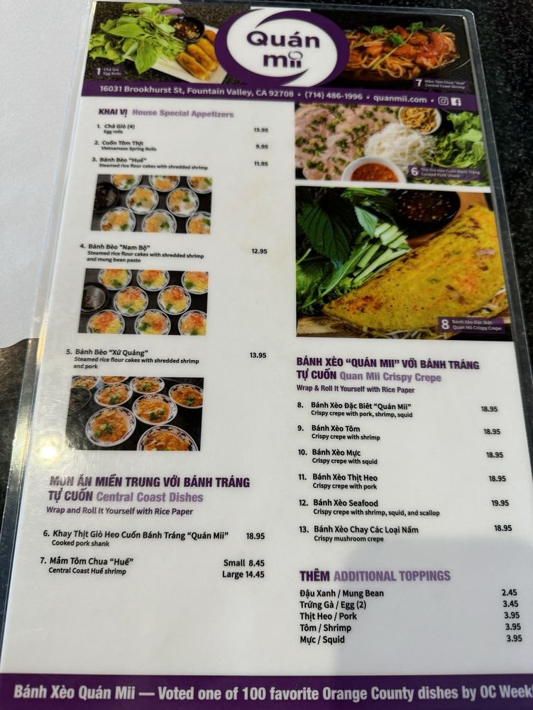 Introducing Quan Mii, a delightful Vietnamese bar located at 16031 Brookhurst St in Fountain Valley, CA, where culinary tradition meets modern comfort. This vibrant eatery specializes in the iconic banh xeo—crispy, flavorful crepes that are a must-try. Prepared fresh, the banh xeo is available in various combinations, ensuring there's something for everyone, including vegetarian options.
